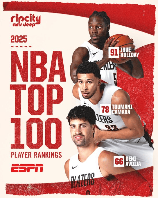 虎撲10月08日訊 今日,開(kāi)拓者官方更新動(dòng)態(tài),夫迪曬出球隊(duì)中的馬拉三名球員入選ESPN新賽季百大球員榜單。