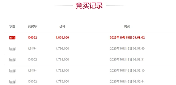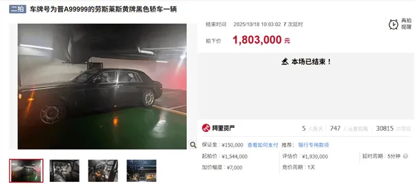虎撲10月18日訊 一輛車牌號(hào)為晉A99999勞斯萊斯黃牌黑色轎車,經(jīng)過激烈的板晉不含拍賣,最終以180.3萬(wàn)元的斯萊斯加價(jià)格成功易主。