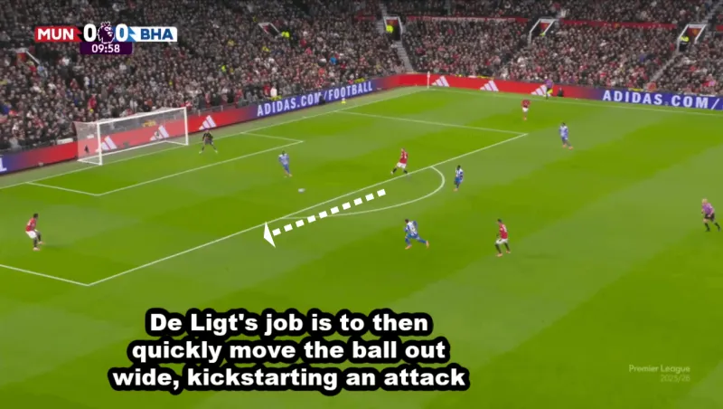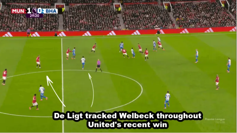 在對(duì)陣布萊頓的比賽中,德利赫特的任務(wù)是盯防維爾貝克,即便這位前鋒回撤到己方半場(chǎng),他也會(huì)一路跟進(jìn)。