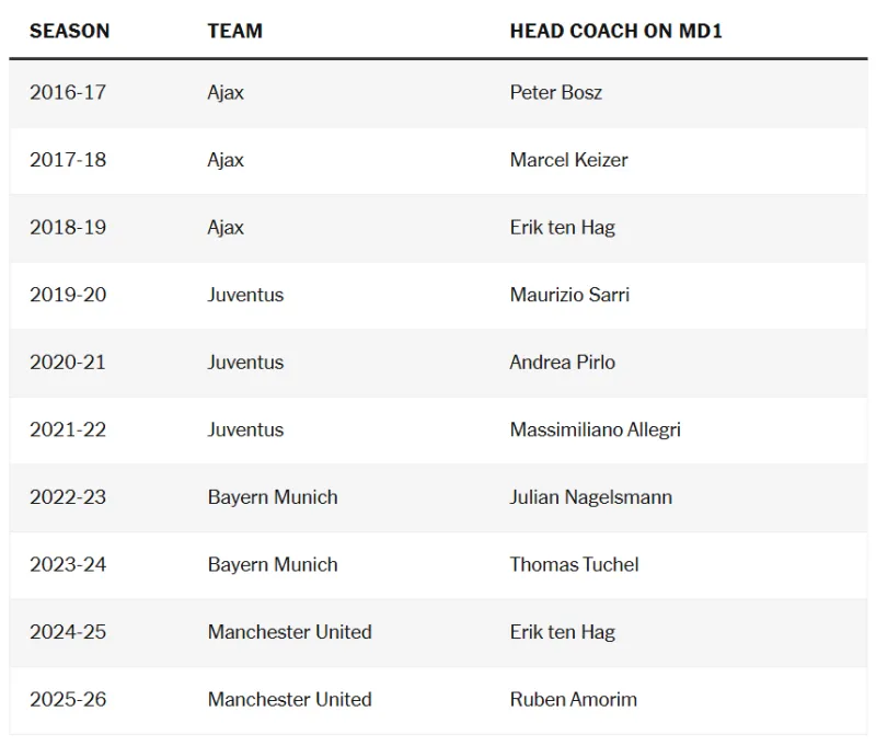 自2016-17賽季完成阿賈克斯一線隊(duì)首秀以來(lái),德利赫特每個(gè)賽季的主教練都與上一年不同。