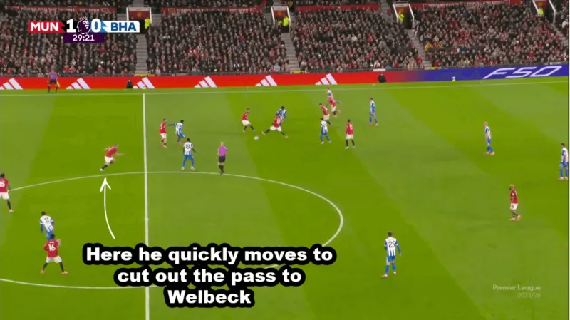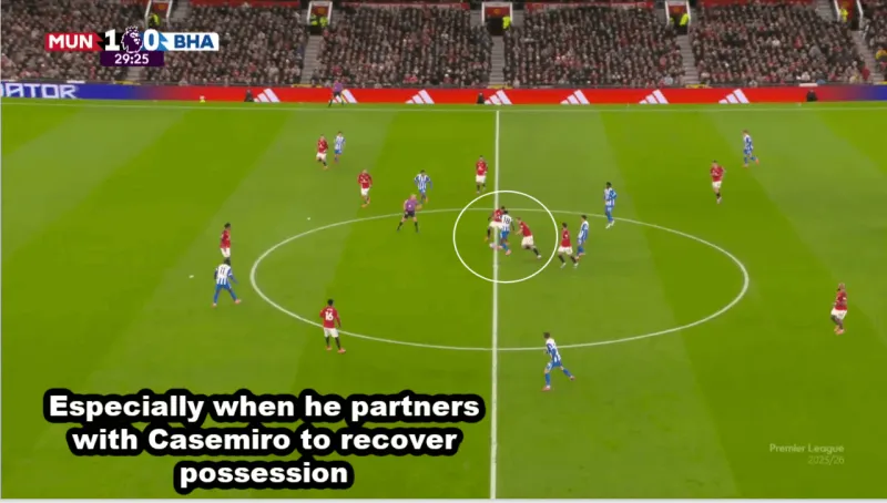 今年5月,阿莫林認(rèn)為這位巴西球員不僅自身狀態(tài)有所提升,自己在使用他擔(dān)任防守中場(chǎng)時(shí)的戰(zhàn)術(shù)安排也更加成熟。近期的戰(zhàn)術(shù)調(diào)整,包括在防守時(shí)變陣為5-4-1,進(jìn)一步穩(wěn)定了卡塞米羅的發(fā)揮。他不再像以前那樣孤立地待在防守端,獨(dú)自面對(duì)英超速度最快、技術(shù)最出色的中場(chǎng)球員;現(xiàn)在他有了支援,B費(fèi)的無(wú)球防守能力正在逐步提升,而且阿莫林麾下至少有一名10號(hào)位球員會(huì)回撤協(xié)防。