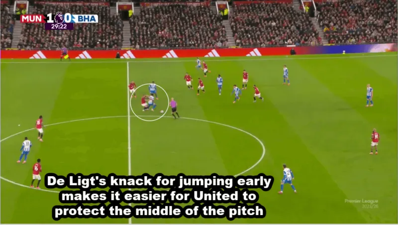 德利赫特正是阿莫林心中的理想選擇。他的搶斷足夠積極,無(wú)需過(guò)分擔(dān)心大范圍區(qū)域的防守問(wèn)題;同時(shí)空中對(duì)抗能力足夠強(qiáng)悍,能在定位球防守中為球隊(duì)提供保護(hù)。