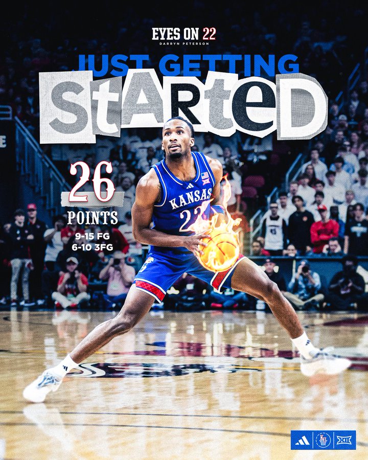 虎撲10月27日訊 堪薩斯大學(xué)官方更新X,曬出一張堪薩斯大學(xué)球員達林-皮特森的流言林賽場照與球迷分享。