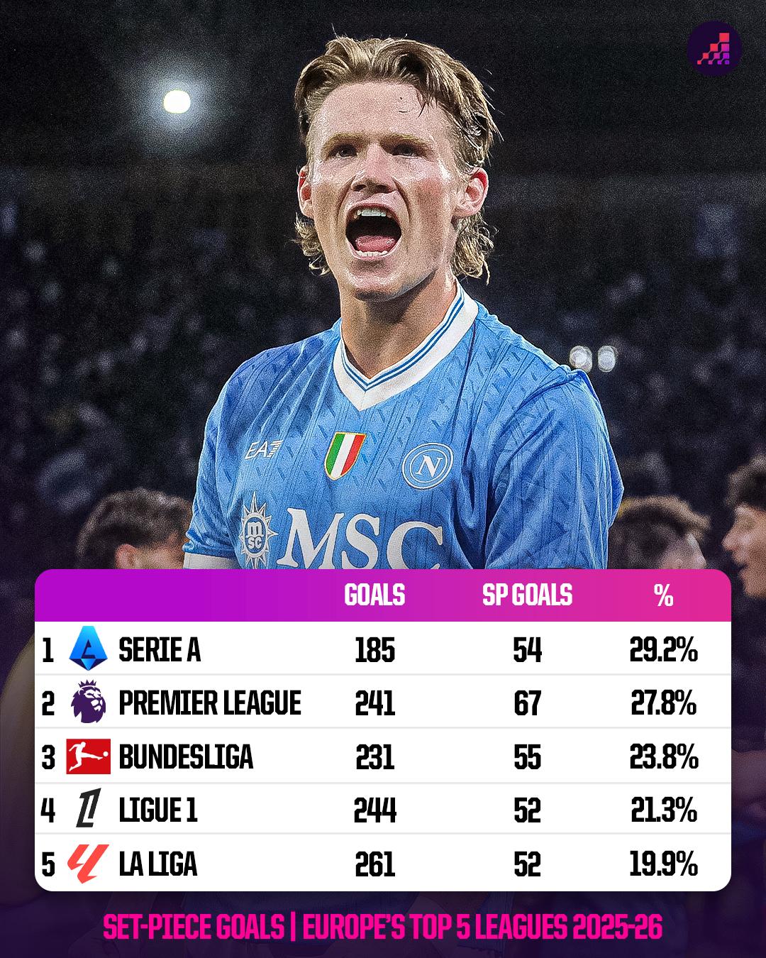 [流言板]本賽季五大聯(lián)賽定位球進(jìn)球占比:意甲29.2%第1,英超第2