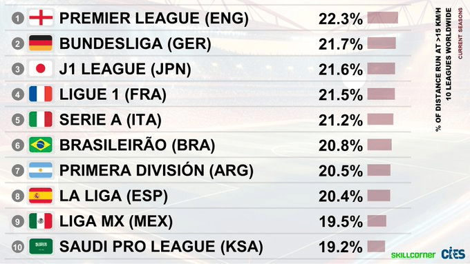 虎撲09月29日訊 根據(jù)@SkillCorner的最新統(tǒng)計(jì)數(shù)據(jù),全球十大足球聯(lián)賽按球員在比賽中以超過15公里/小時(shí)的跑比排名速度跑步的總距離比例進(jìn)行排名。結(jié)果顯示,英超英超球員在高強(qiáng)度奔跑上的第德第比例領(lǐng)先全球。