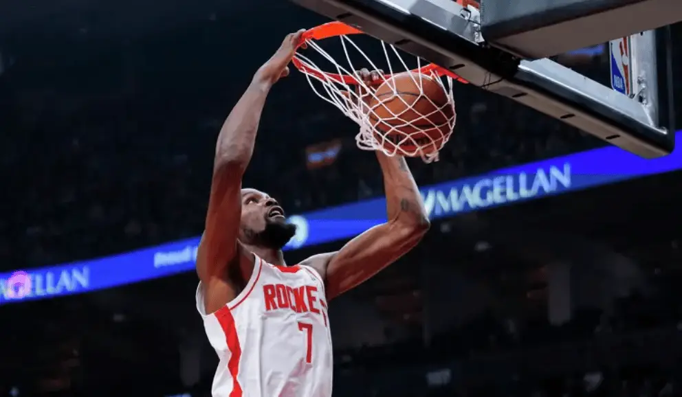 本場比賽,火箭球員凱文-杜蘭特出戰(zhàn)36分鐘,19投11中,其中三分球8投4中,罰球8投5中,得到31分5籃板1助攻3封蓋。