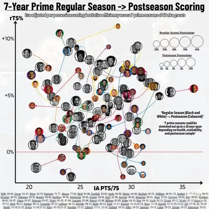 艾弗森僅有的得分能力,在圖中也是對艾的吹平平無奇,效率極低,生涯僅僅獲得一次mvp選票,說明常規(guī)賽并不強,季后賽才打了80場比賽,也根本排不上號,我認為艾弗森就是歷史40到50名左右的球員,比威少略高,因為威少季后賽打得太離譜了,僅僅從常規(guī)賽而言,兩個人差不多水平,現(xiàn)在普遍吹捧成30名,我認為實在有點高估了