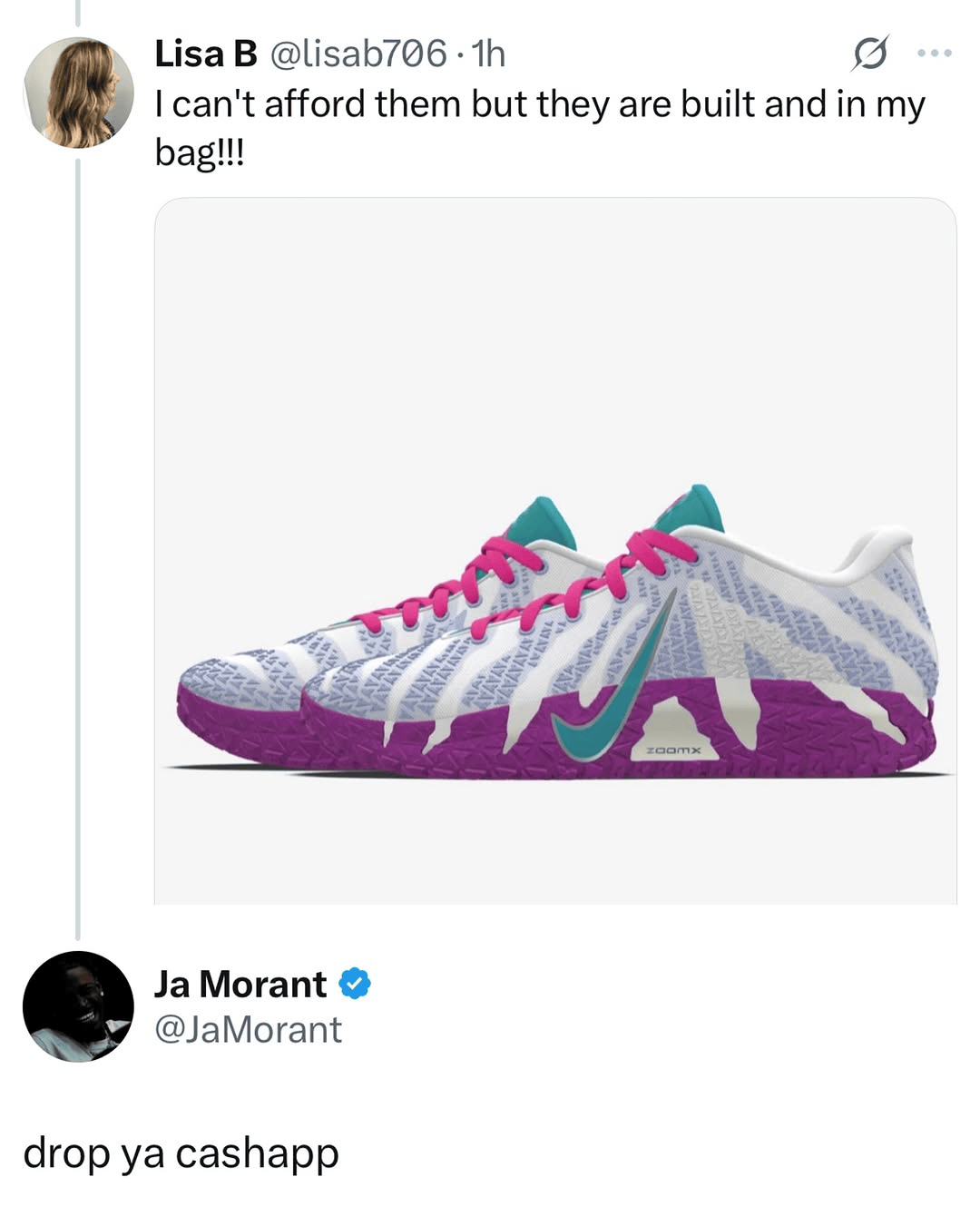 隨后,為名海外一名莫蘭特粉絲因無(wú)力支付球鞋購(gòu)買(mǎi)費(fèi)用(140美元),粉絲便在莫蘭特推特賬號(hào)下留言“我買(mǎi)不起這雙我親自設(shè)計(jì)的設(shè)計(jì)球鞋”,莫蘭特回應(yīng)了這位粉絲并為她支付了球鞋費(fèi)用。買(mǎi)單