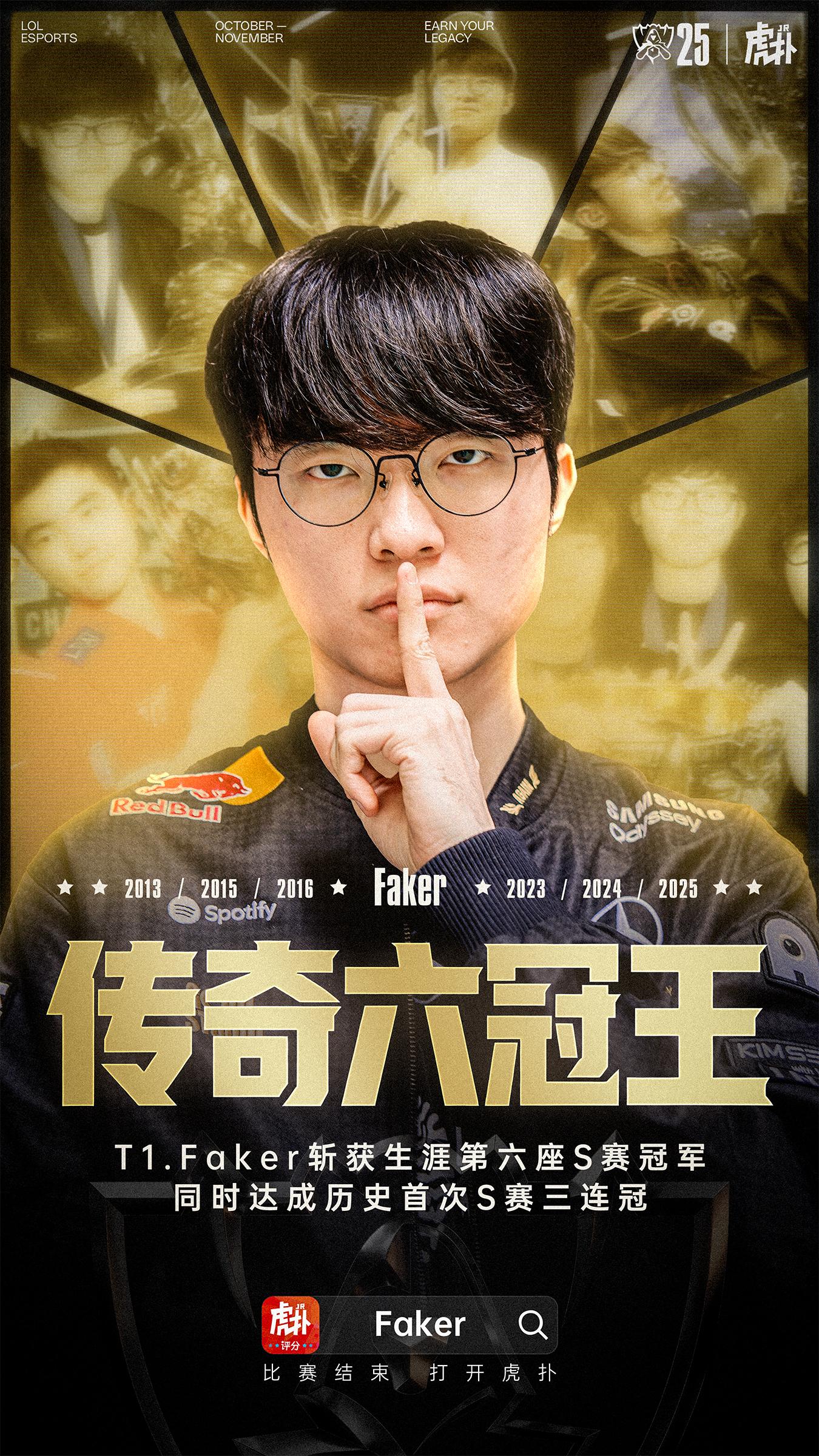 虎撲11月09日訊 2025英雄聯(lián)盟全球總決賽決賽T1以3比2戰(zhàn)勝KT獲得冠軍,T1中單Faker選手?jǐn)孬@生涯第六座S賽冠軍,涯第同時(shí)達(dá)成歷史首次S賽三連冠。賽冠史首賽連