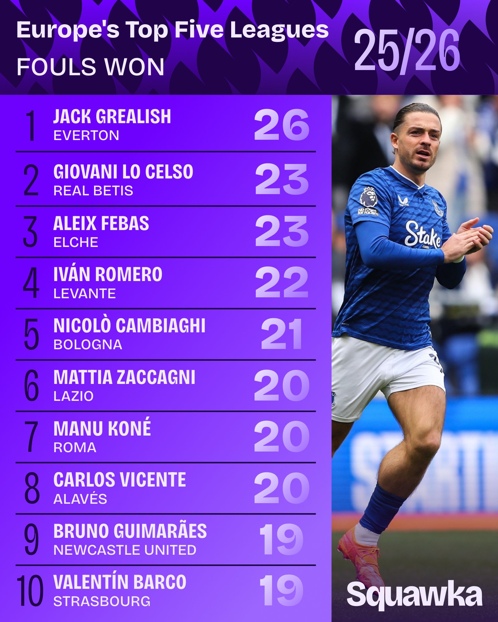 虎撲10月16日訊 Squawka數(shù)據(jù)統(tǒng)計本賽季至今五大聯(lián)賽被犯規(guī)榜,格拉利什26次排名第一。格拉規(guī)次