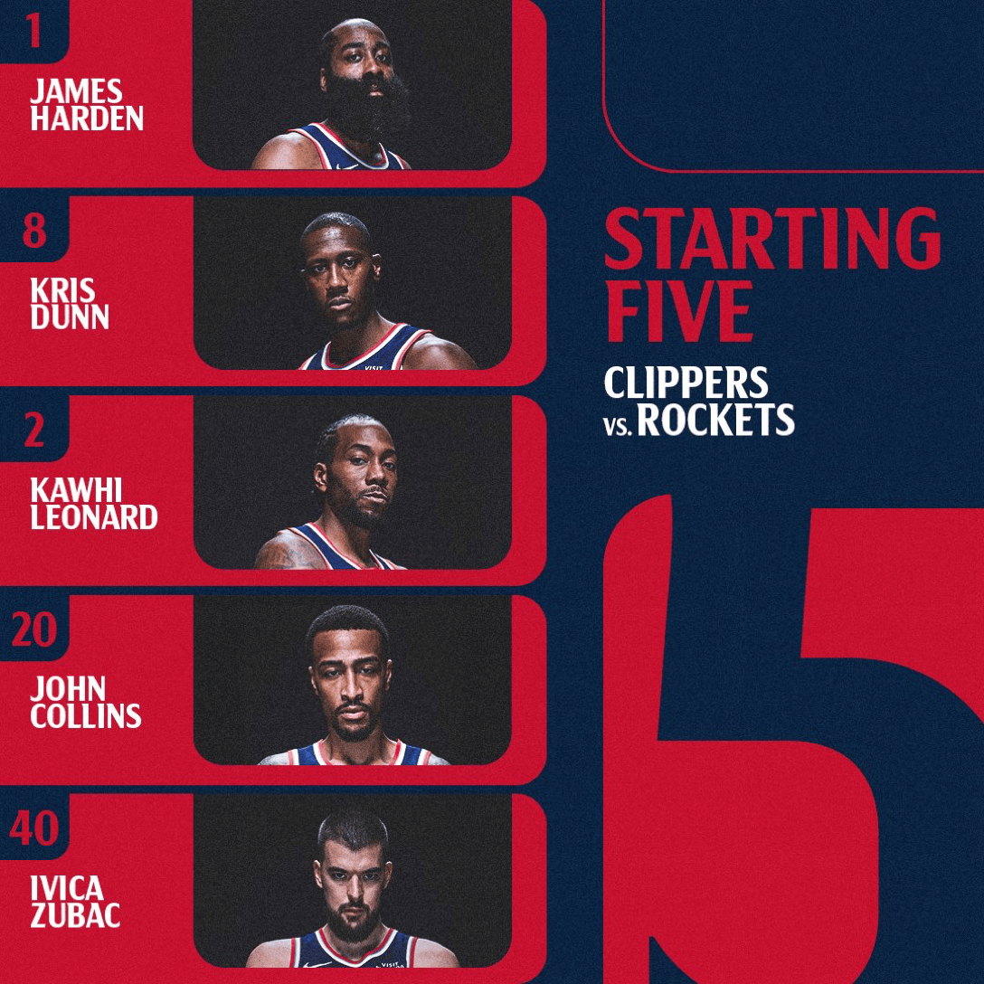 [流言板]快船今日首發(fā):哈登、鄧恩、倫納德、科林斯、祖巴茨