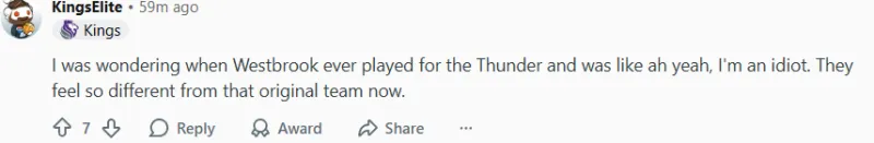 -我在想威斯布魯克什么時候為雷霆效力過,然后就想啊,是啊,我是個白癡。他們現(xiàn)在的感覺和原來那支球隊太不一樣了。