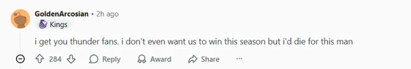 -(284贊)我知道你們是雷霆球迷,我甚至不希望我們贏下本賽季的比賽,但我愿意為他去死。