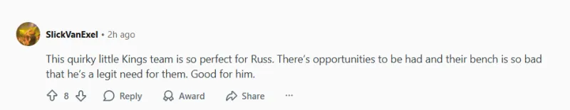 -這支有點古怪氣質(zhì)的小國王隊簡直太適合威少了。這里有大量機會可以發(fā)揮,而且他們的替補太差了,以至于他對他們來說是一個真正的需求。為他感到高興。