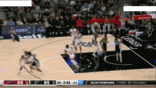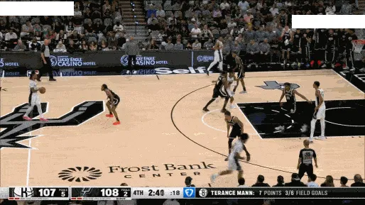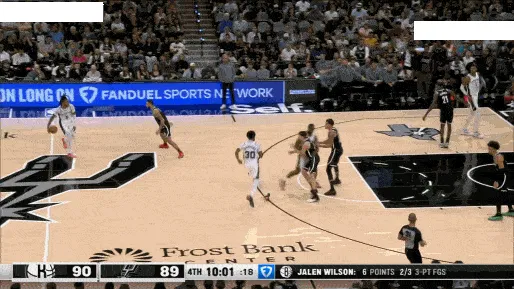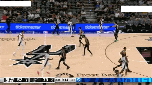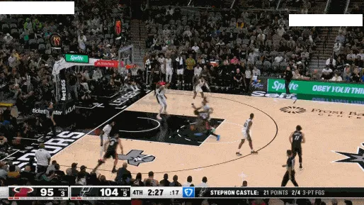 同時(shí)為了共同促成文班的這次打法轉(zhuǎn)變和馬刺進(jìn)攻端打法的重塑,在保證防守反擊的基礎(chǔ)上,馬刺目前是在大量的開(kāi)發(fā)文班的陣地進(jìn)攻能力的(特別是卡斯?fàn)柎钆湮陌嗟氖装l(fā)陣容,以至于有時(shí)候我都會(huì)覺(jué)得打的過(guò)于“保守(慢)”了)。從第二場(chǎng)開(kāi)始各個(gè)球隊(duì)就發(fā)現(xiàn),在陣地戰(zhàn)中除了夾擊對(duì)付文班之外,掐死馬刺的單核發(fā)動(dòng)機(jī)(卡斯?fàn)枺彩怯袠O大收益的,且由于進(jìn)攻端的配合需要,保證有第二強(qiáng)點(diǎn)突破撕裂防線,卡斯?fàn)栐诤芏嗷睾现惺桥c文班同站強(qiáng)側(cè)的,這時(shí)對(duì)面球隊(duì)直接選擇讓防守卡斯?fàn)柕那騿T放掉卡斯?fàn)柕耐渡淙A擊文班,既夾擊了文班又封堵了卡斯?fàn)柕耐黄坡肪€(其他三人還是保持三對(duì)三),簡(jiǎn)直是“一舉兩得”的好買賣。