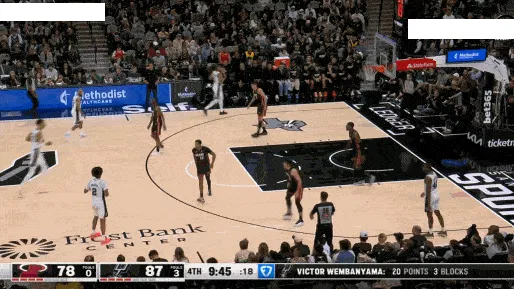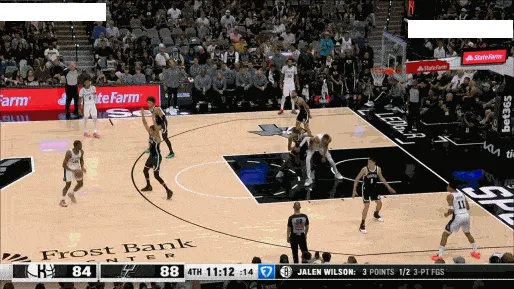 文班&馬刺目前在鍛煉的,正是對(duì)①、②、③這三種進(jìn)攻發(fā)起方式中前兩種短板的提升,且目前偏重于①。誠(chéng)然目前的文班還無(wú)法像呆子或幫主那樣,在某個(gè)時(shí)間段里(甚至整場(chǎng)比賽)連續(xù)作為進(jìn)攻發(fā)起的支點(diǎn),但在某些回合中,文班已經(jīng)展現(xiàn)了有這樣的潛力,如下圖。