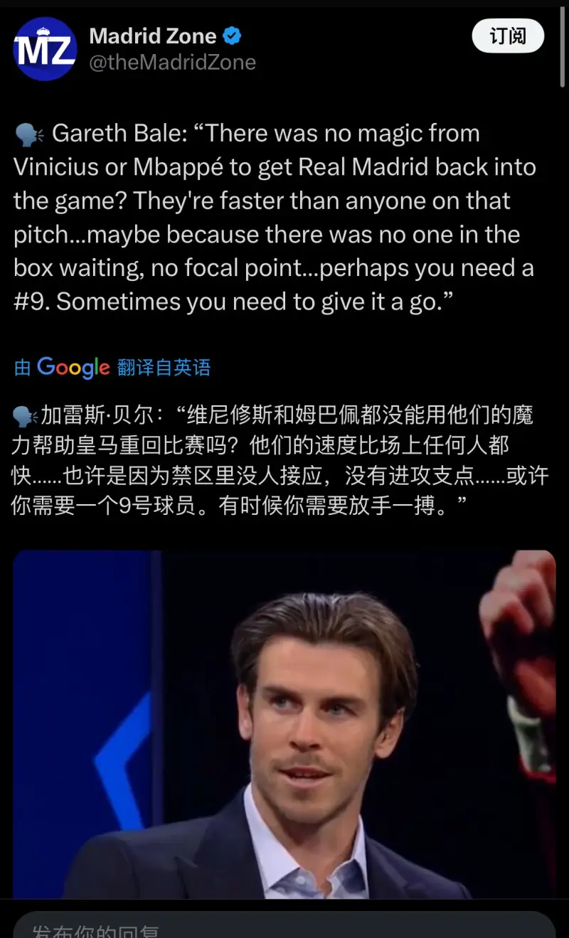 貝爾:“他們的速度比場上任何人都快……也許是因為禁區(qū)里沒人接應(yīng),沒有進攻支點……或許你需要一個9號球員。爾皇有時候你需要放手一搏。馬或”