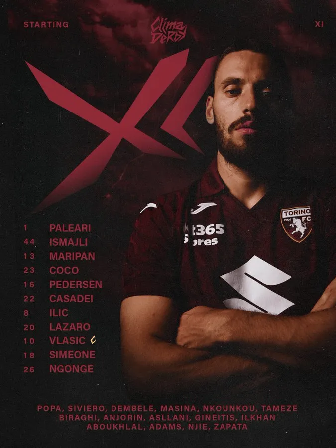 都靈首發(fā):1-帕萊亞里、13-馬里潘、16-佩德森、20-拉扎羅、44-伊斯邁利、8-伊利奇、22-卡薩迪、10-弗拉西奇、18-吉奧瓦尼·西蒙尼、23-科科、26-恩貢戈