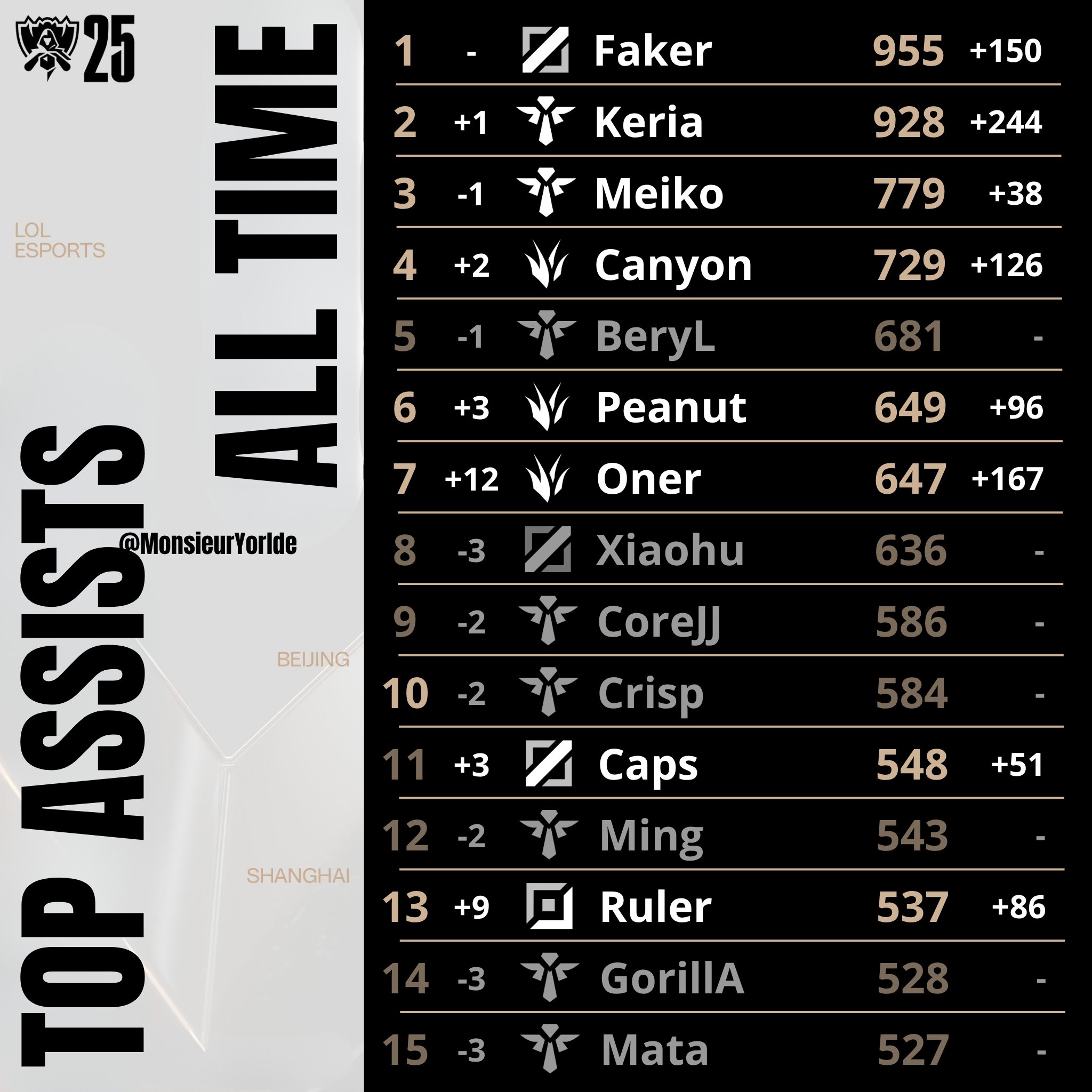 虎撲11月06日訊 今日外媒統(tǒng)計全球總決賽最新助攻榜,從數(shù)據(jù)來看,媒統(tǒng)Faker、計全決賽Keria選手有望在11月9日的球總千決賽達成破千成就,而Keria選手也有望超越Faker選手來到助攻榜第一的最新助攻位置。