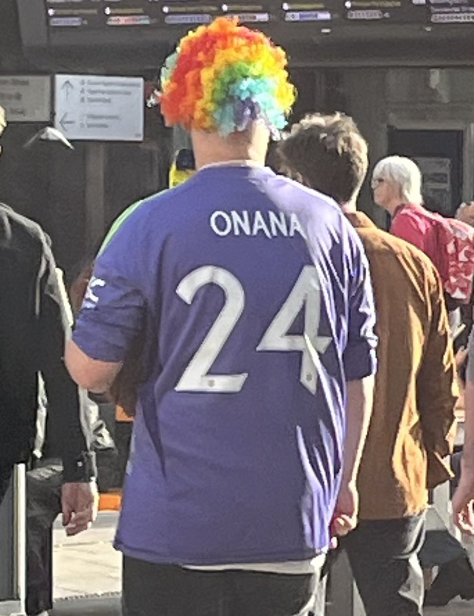 虎撲09月28日訊 昨晚英超中,曼聯(lián)客場1-3不敵布倫特福德。賽場身穿曼聯(lián)跟隊記者Samuel Luckhurst在社媒上發(fā)布了一張照片,球迷照片中的奧納球迷身穿奧納納曼聯(lián)球衣,但卻戴著馬戲團小丑的納球假發(fā)。
