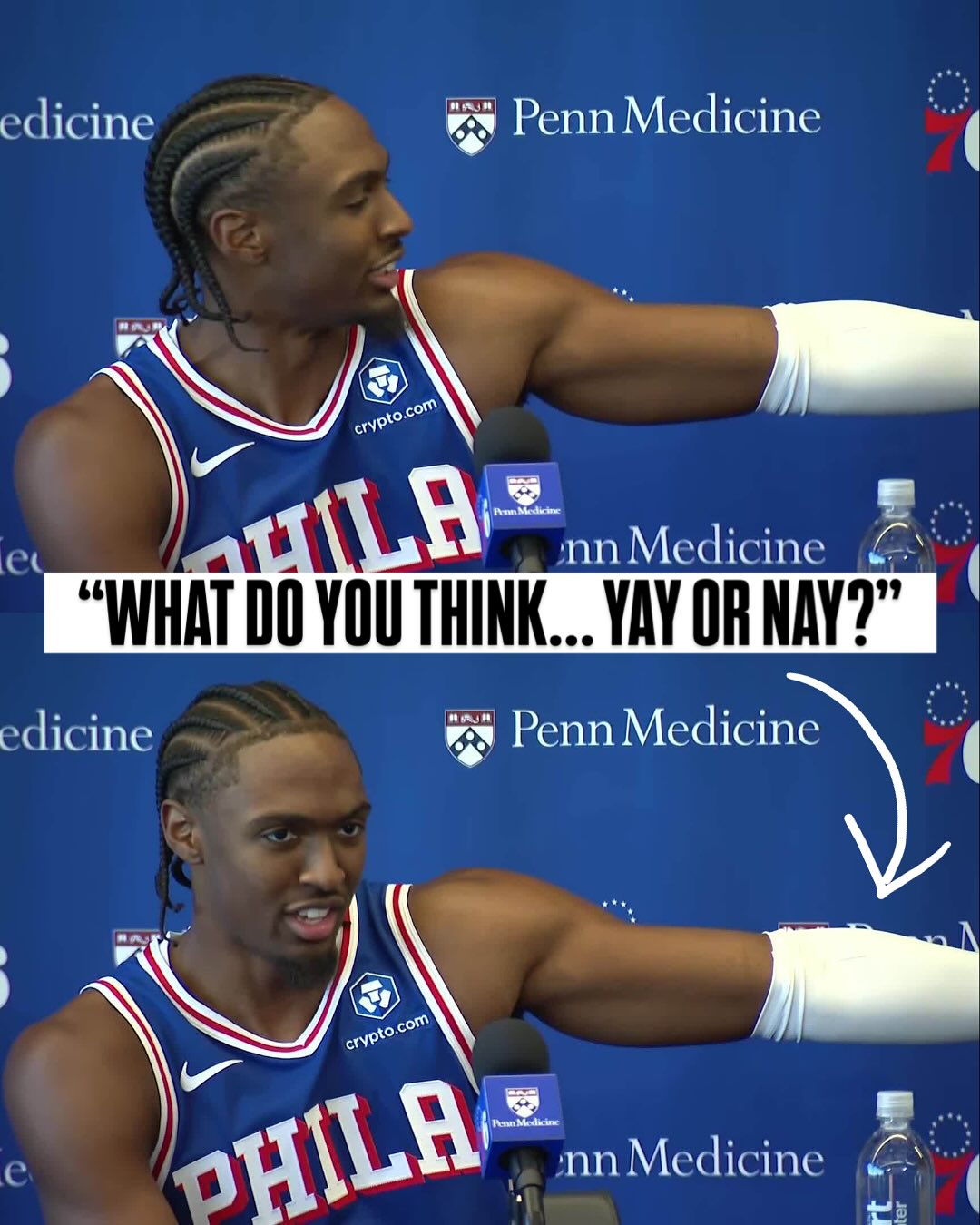 其寫道:馬克西今夏忙碌后以新造型亮相媒體日,官媒他佩戴護(hù)臂并提問“你們覺得這護(hù)臂咋樣?贊成還是曬馬賽季反對?”