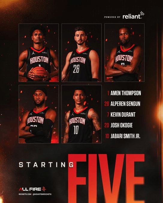 賽前,奧科火箭官方公布了球隊(duì)的首發(fā)陣容: