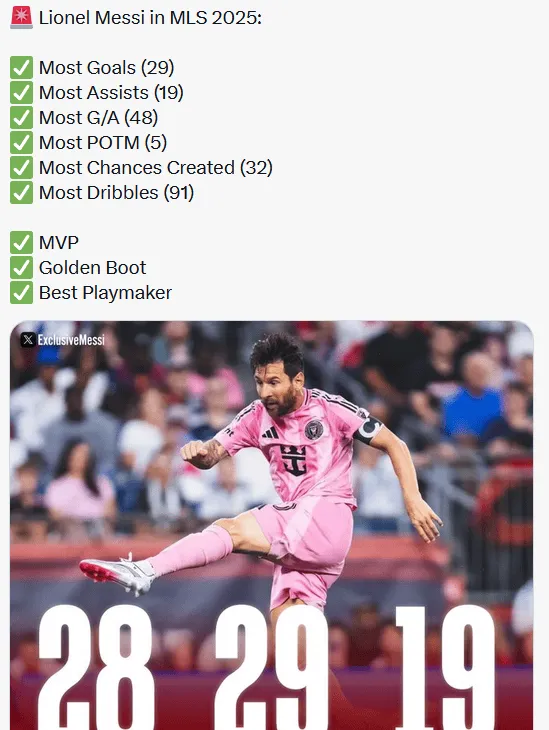 作為梅西到美職聯(lián)的第二個完整賽季,常規(guī)賽結(jié)束后,價梅梅西同時當選當賽季進球最多,西美助攻最多,職聯(lián)當場最佳最多,賽季創(chuàng)造絕佳機會最多,何評成功盤帶最多的價梅球員