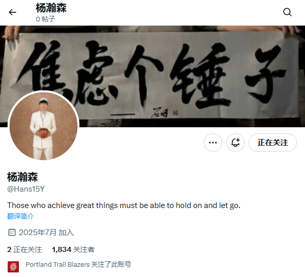 虎撲07月04日訊 楊瀚森近日開通個(gè)人社媒X賬號(hào),背景圖為《焦慮個(gè)錘子》。瀚森號(hào)背