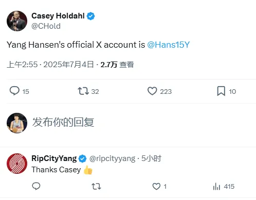 開拓者跟隊(duì)記者Casey Holdahl分享動(dòng)態(tài):這里是楊瀚森的個(gè)人X賬號(hào),@楊瀚森。