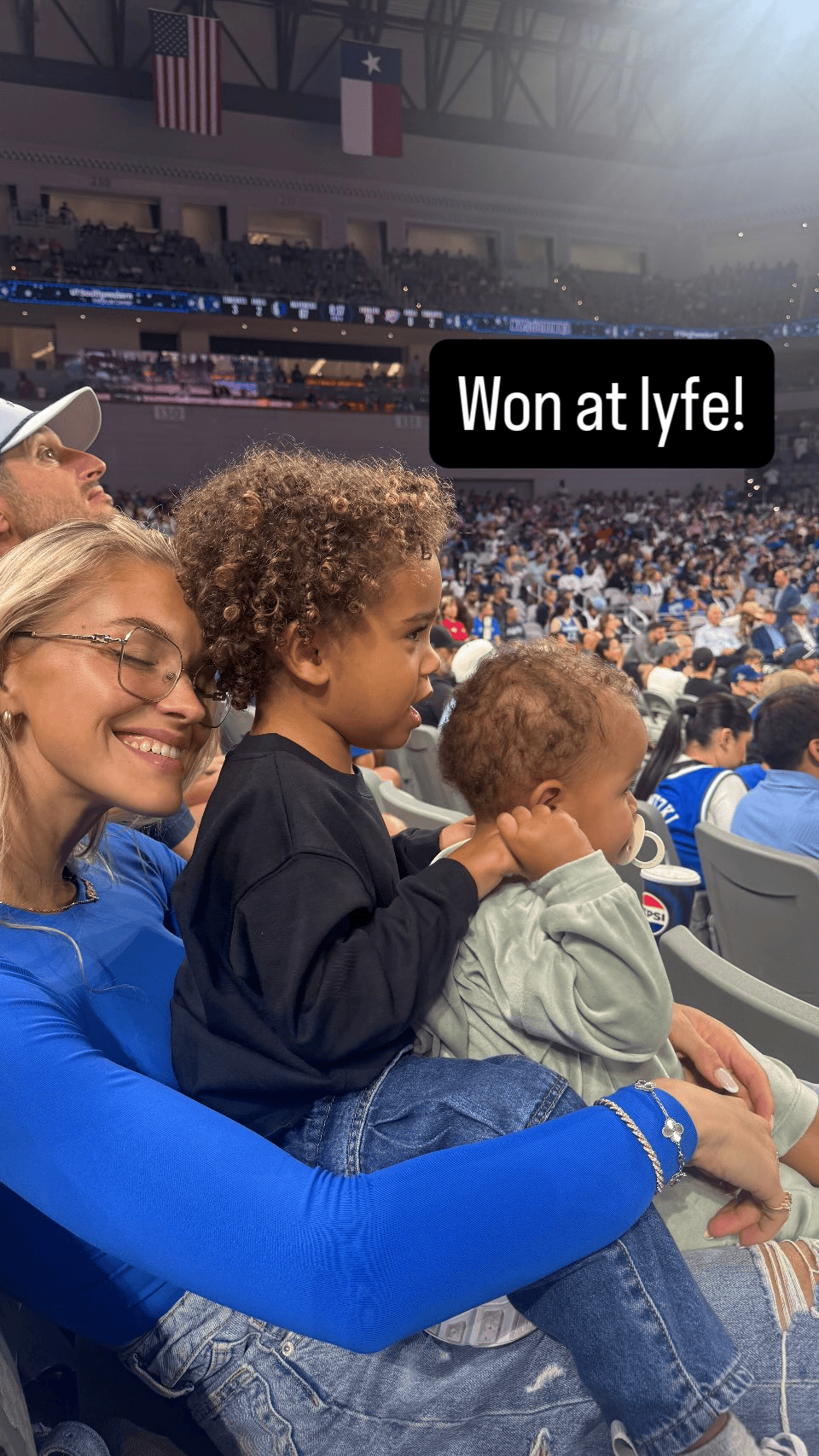 虎撲10月07日訊 獨(dú)行俠球員丹吉洛-拉塞爾更新社媒,曬出了一張自己妻子帶著孩子們觀戰(zhàn)自己季前賽的妻兒照片。
