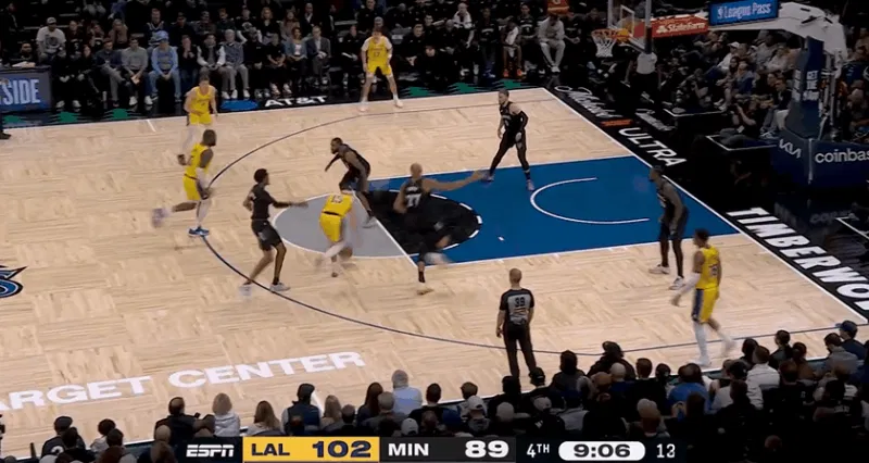 NBA常規(guī)賽,湖人對(duì)陣森林狼的攻拉比賽正在進(jìn)行中。