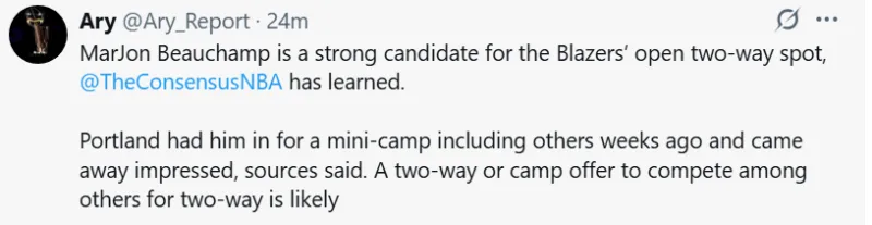 虎撲09月16日訊 據(jù)記者Ary報道,@The馬喬ConsensusNBA透露,自由球員馬喬恩-比徹姆是馬喬開拓者目前雙向合同席位的有力競爭者。