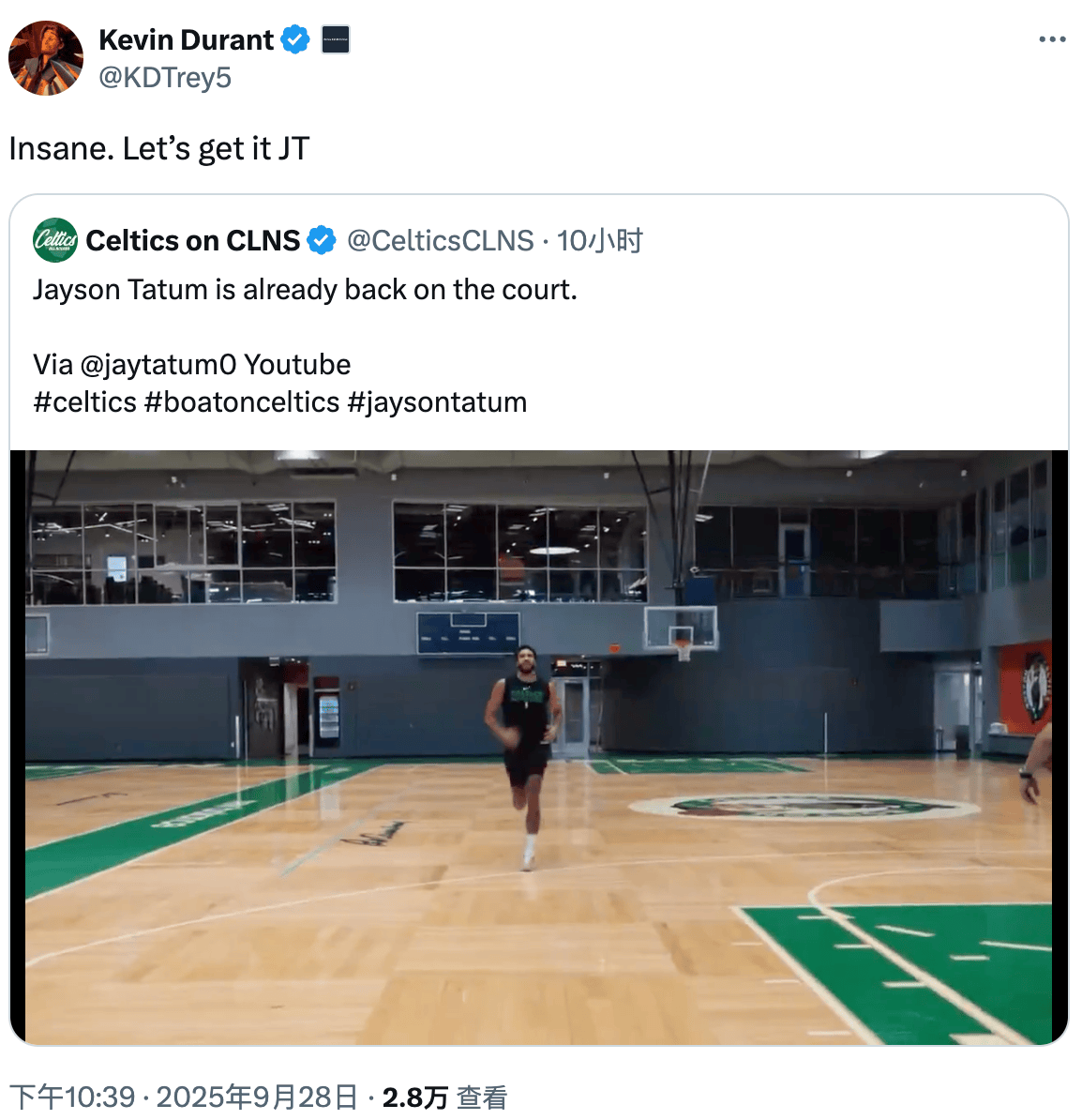 火箭前鋒凱文-杜蘭特轉(zhuǎn)發(fā)了這段視頻,塔圖并且評(píng)論道:“瘋狂,歸賽加油啊JT”