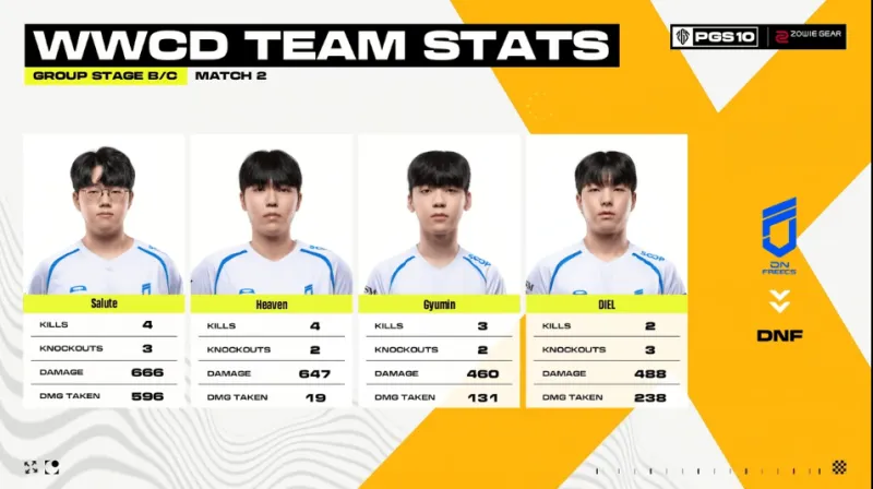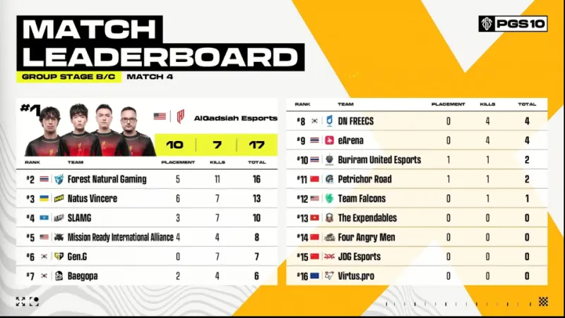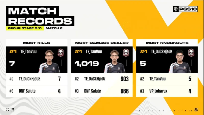 階段6,圈型刷在養(yǎng)雞場(chǎng)北部麥田。TE兩人進(jìn)攻FOR方向,依靠TanVuu亮眼發(fā)揮,F(xiàn)OR先被淘汰出局,隨后4AM兩人也被TE淘汰。階段7,DNF與VP交戰(zhàn),VP被DNF與TE夾擊淘汰。