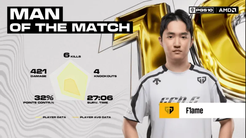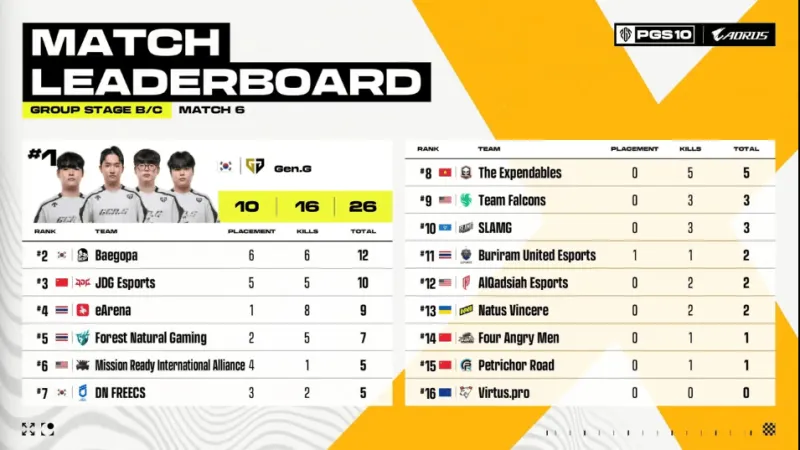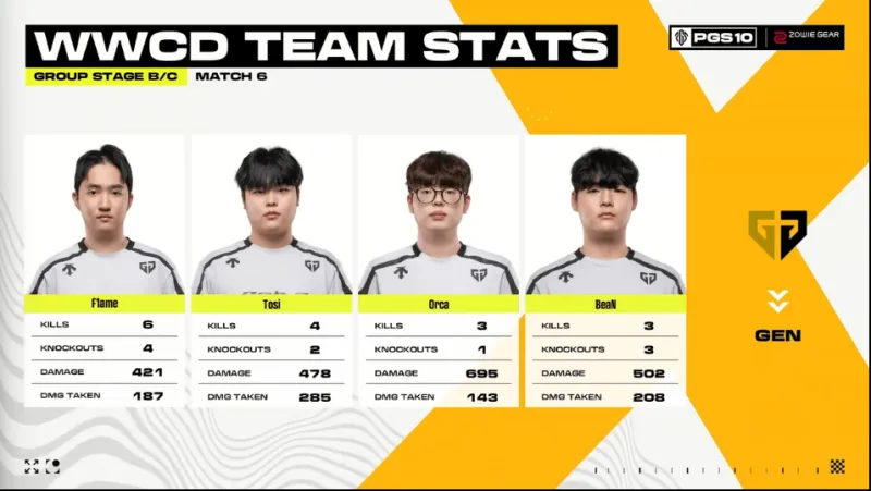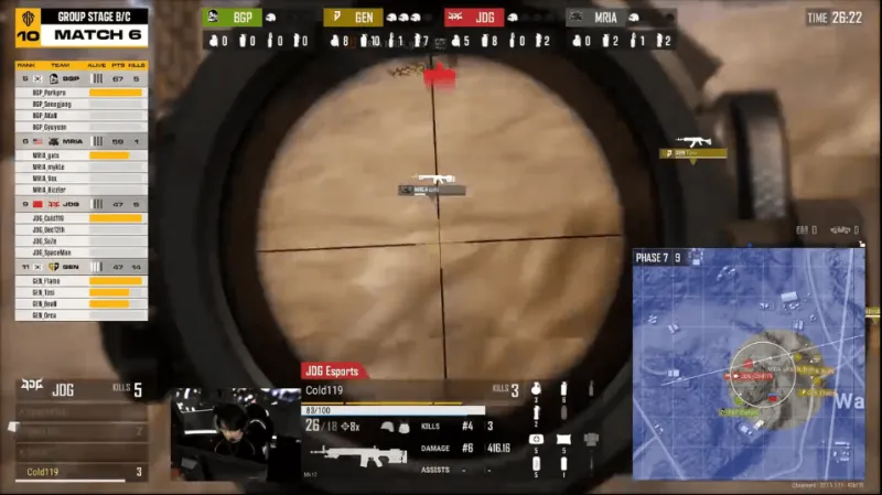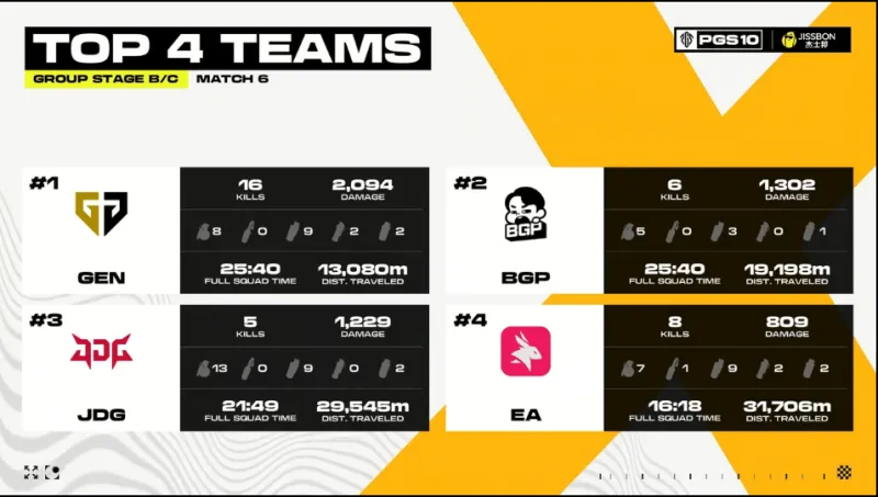 決賽圈,BGP滿編開車撞擊GEN方向,但被GEN淘汰三人,隨后MRIA獨(dú)狼與JDG獨(dú)狼先后被淘汰,最終GEN將BGP最后一人淘汰,GEN成功吃雞。