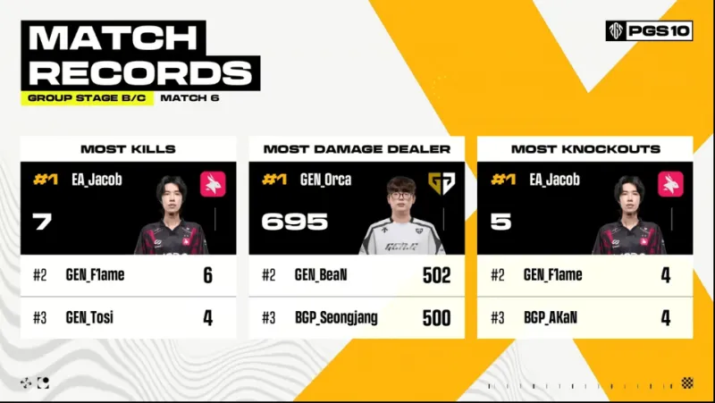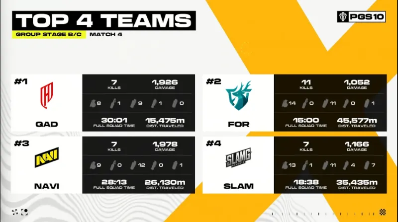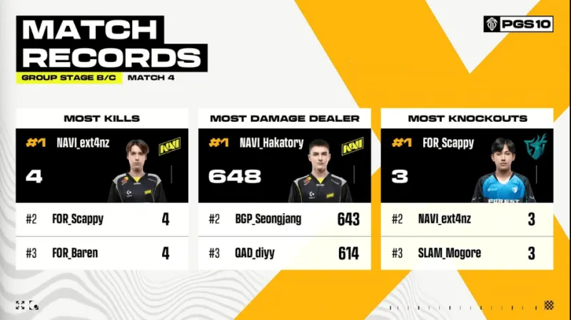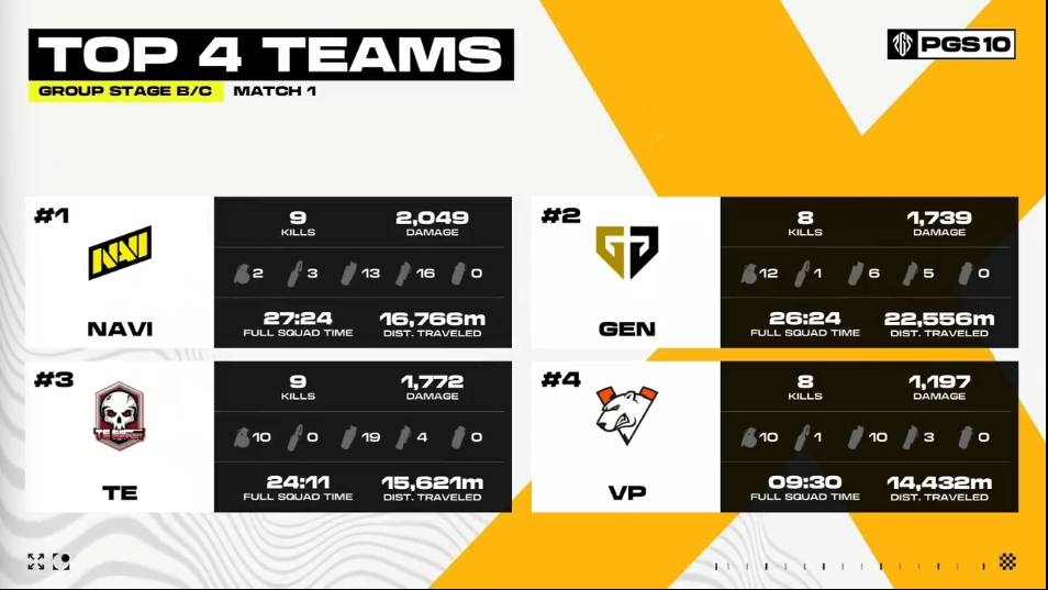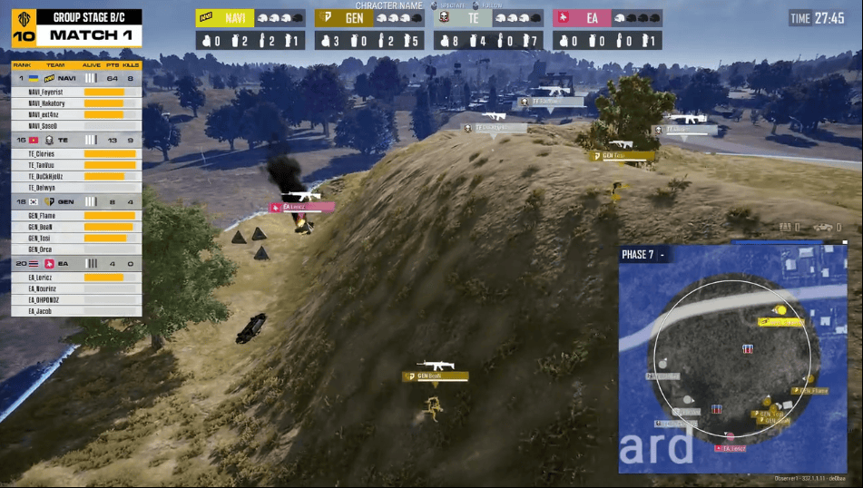 決賽圈,GEN先將EA最后一人淘汰。隨后GEN將圈邊掛后的Tanvuu打掉,TE兩人前來(lái)支援也被淘汰。最終NAVI占據(jù)更好位置輕松吃雞。