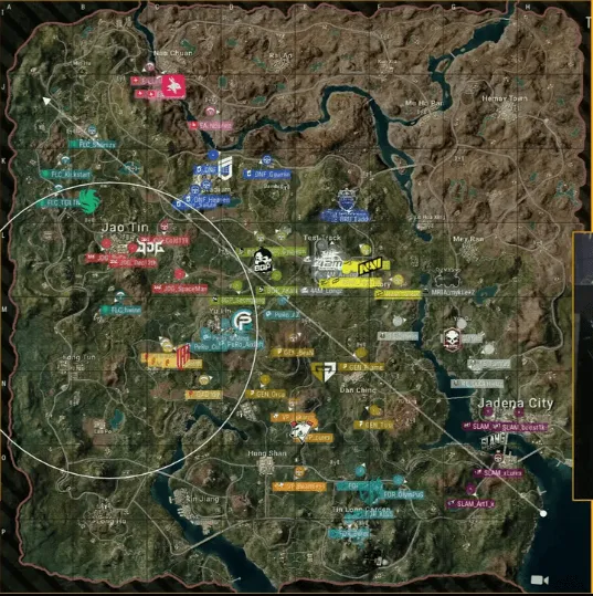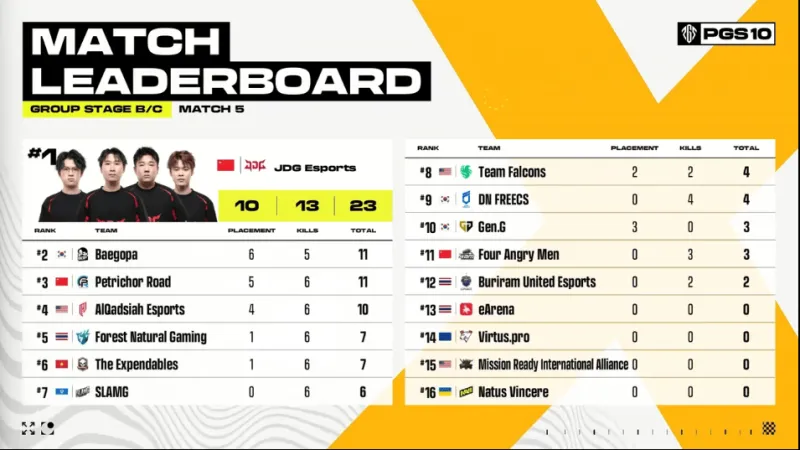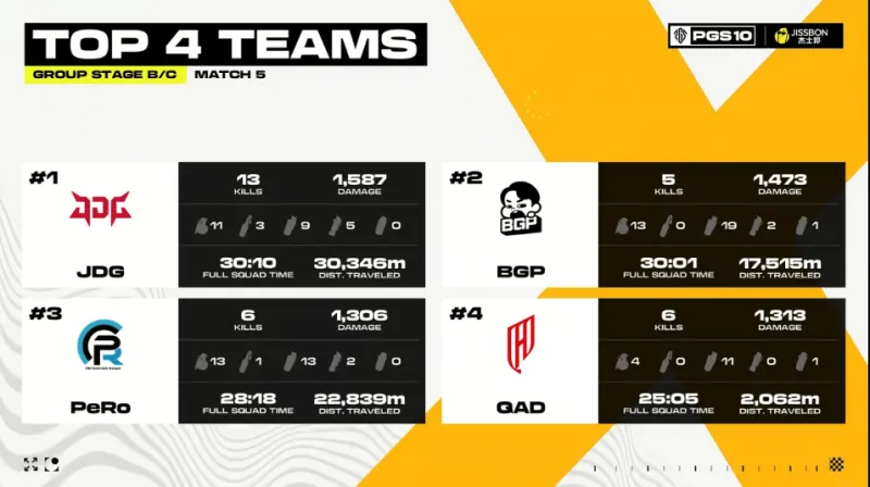 階段7,圈型刷在地圖礦場(chǎng)東側(cè)山坡附近。圈邊的GEN與QAD先被淘汰,PeRo也被JDG與BGP兩隊(duì)夾擊淘汰。最終剩余JDG與BGP四v四大戰(zhàn),JDG團(tuán)滅對(duì)手吃下一雞。