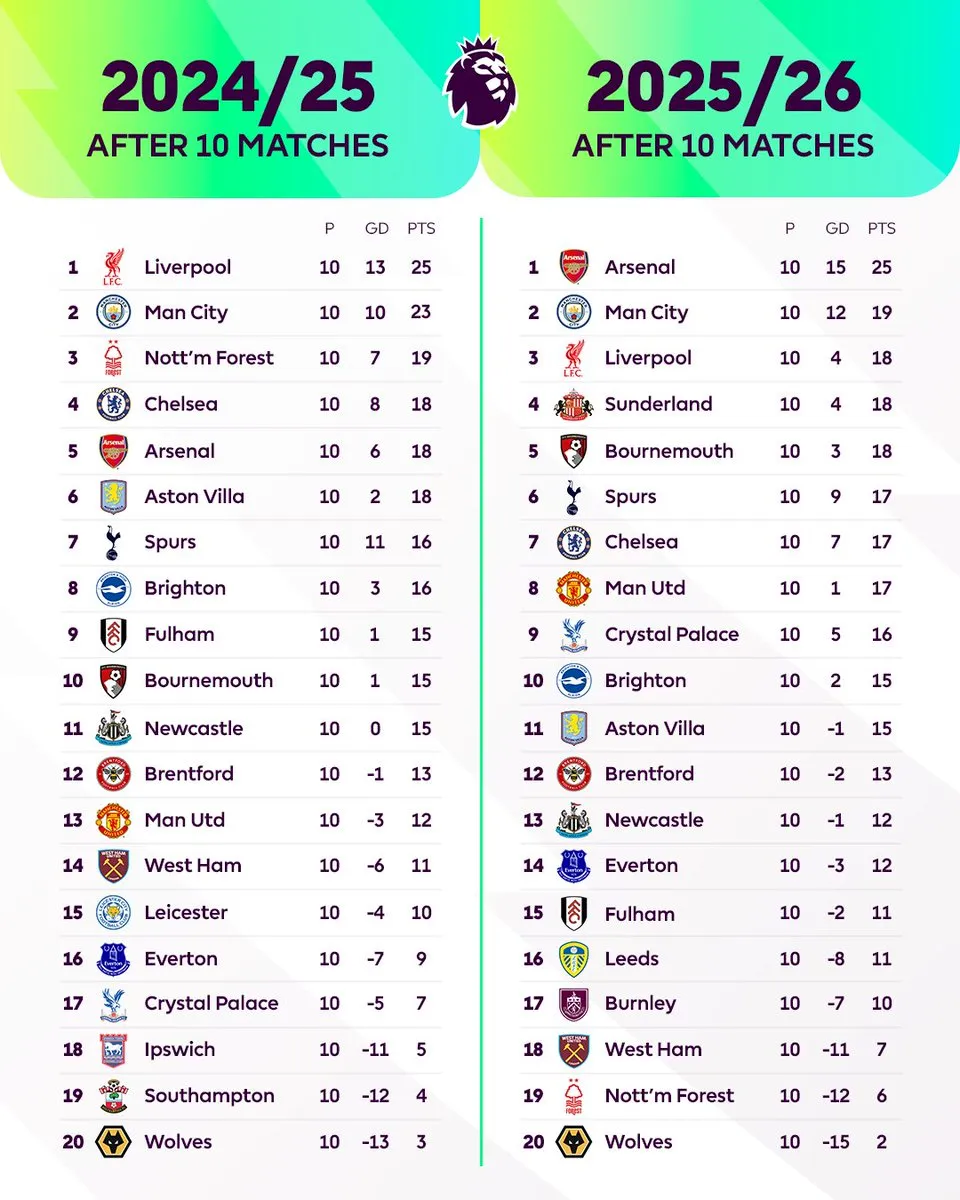 虎撲11月06日訊 英超前10輪的比賽已經(jīng)結(jié)束,英超官方發(fā)布對(duì)比最近兩個(gè)賽季10輪后積分榜的森納對(duì)比圖。