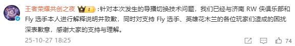 虎撲10月27日訊 共創(chuàng)之夜官方發(fā)文:導(dǎo)播切換技術(shù)問題,已向RW俠和Fly道歉
