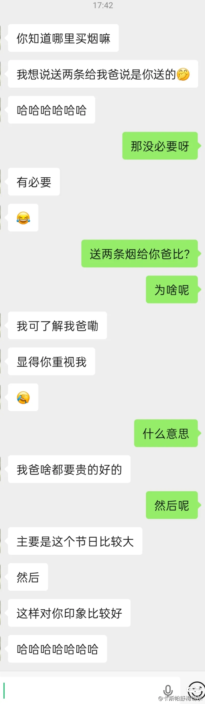 剛剛她給我發(fā)微信,如下對(duì)話,問一下大家是什么意思?我自己覺得還不到送兩條煙的地步。