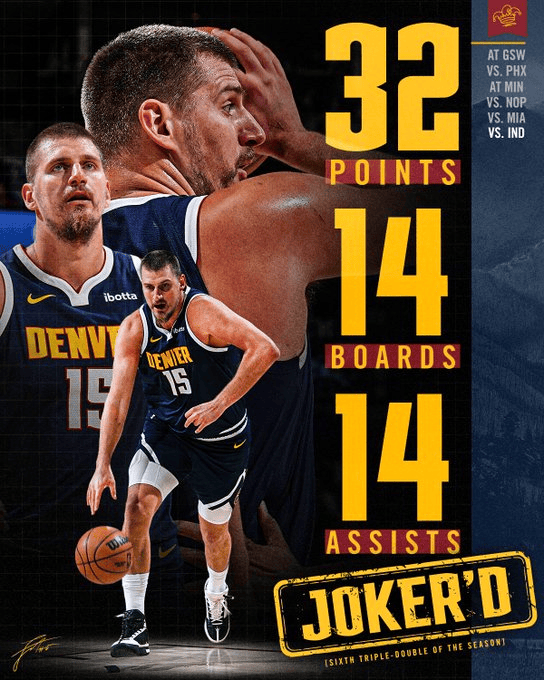 [流言板]掘金官方曬約基奇數(shù)據(jù)海報:不到32分鐘就砍下32分14板14助