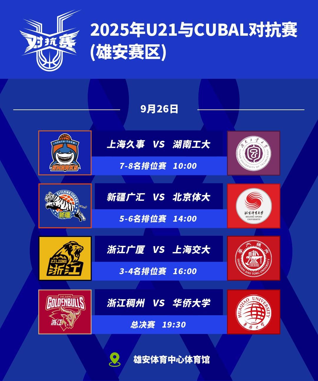 虎撲09月26日訊 CYBL官方公布今日U21與CUBAL對(duì)抗賽賽程。