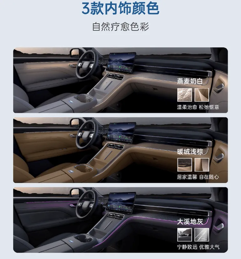 內(nèi)飾方面,AION i60與AION V一樣采用極簡的設(shè)計(jì)風(fēng)格,但AION i60的整體感更強(qiáng),新車采用上下雙色的內(nèi)飾設(shè)計(jì),金屬質(zhì)感的裝飾將上下分成,內(nèi)飾提供燕麥奶白、暖絨淺棕、大溪地灰3種顏色,32色氛圍燈打造溫馨家居氛圍。