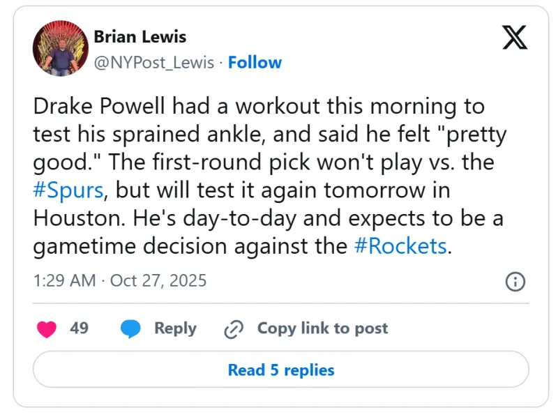 布萊恩·劉易斯也分享了關(guān)于德雷克·鮑威爾的最新情況,他似乎在賽季揭幕戰(zhàn)中扭傷腳踝后恢復(fù)良好。