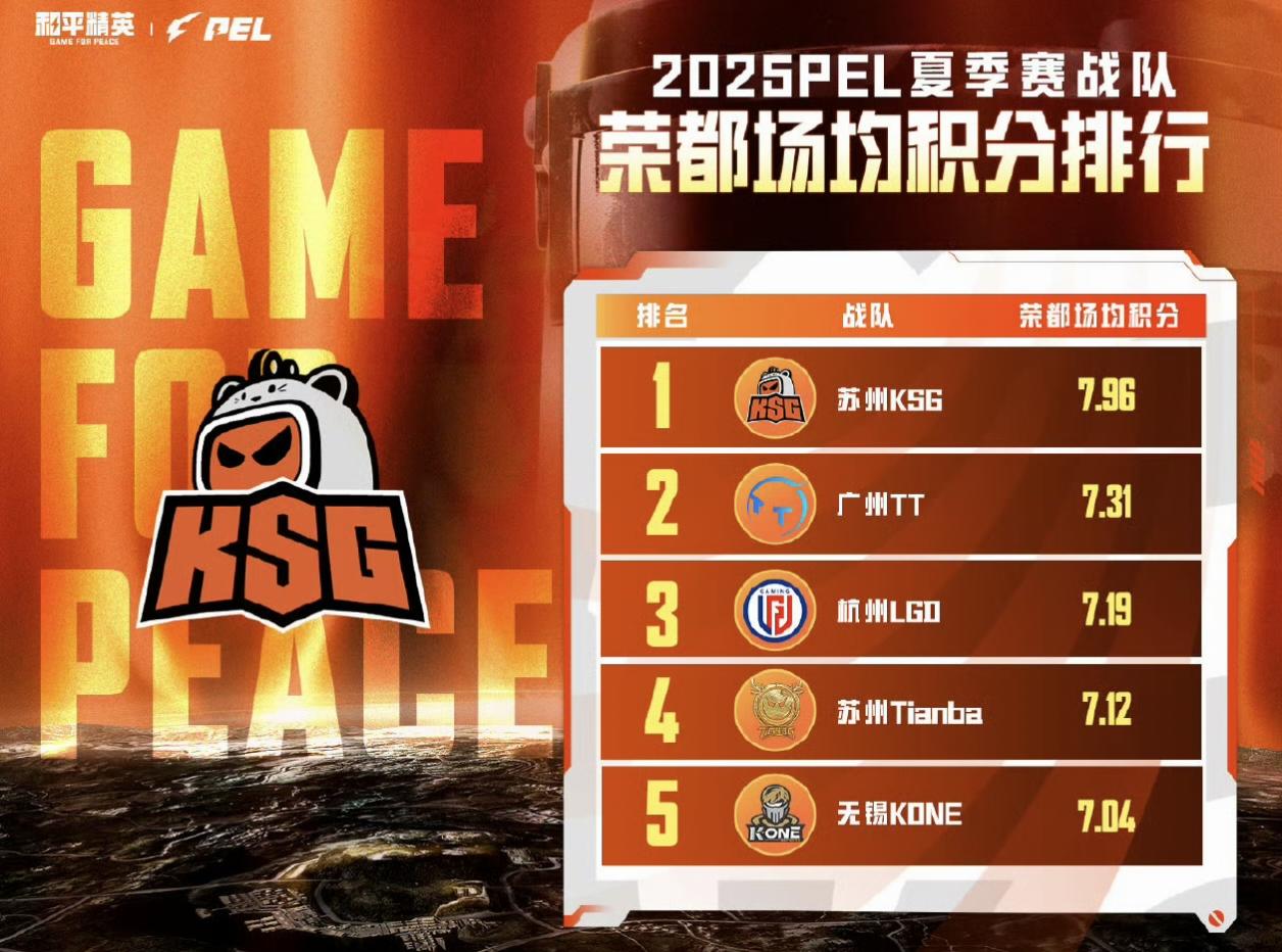 蘇州KSG和平精英分部 憑借7.96的賽數(shù)場(chǎng)均積分,位居戰(zhàn)隊(duì)榮都場(chǎng)均積分排行榜首!夏季