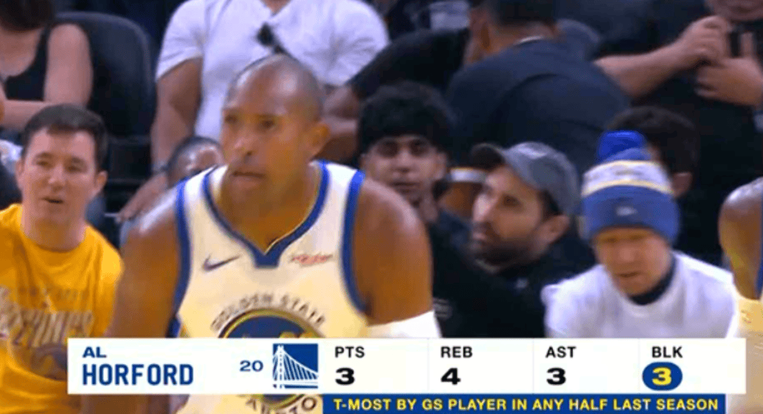 比賽上半場,場字次封勇士新援艾爾-霍福德拿到3分4籃板3助攻3封蓋。幕霍