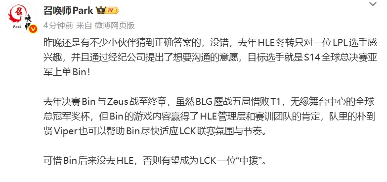 [JR熱議]爆料今日揭曉:HLE去年想接觸Bin,熱議其游戲內(nèi)容贏得了HLE的爆料
