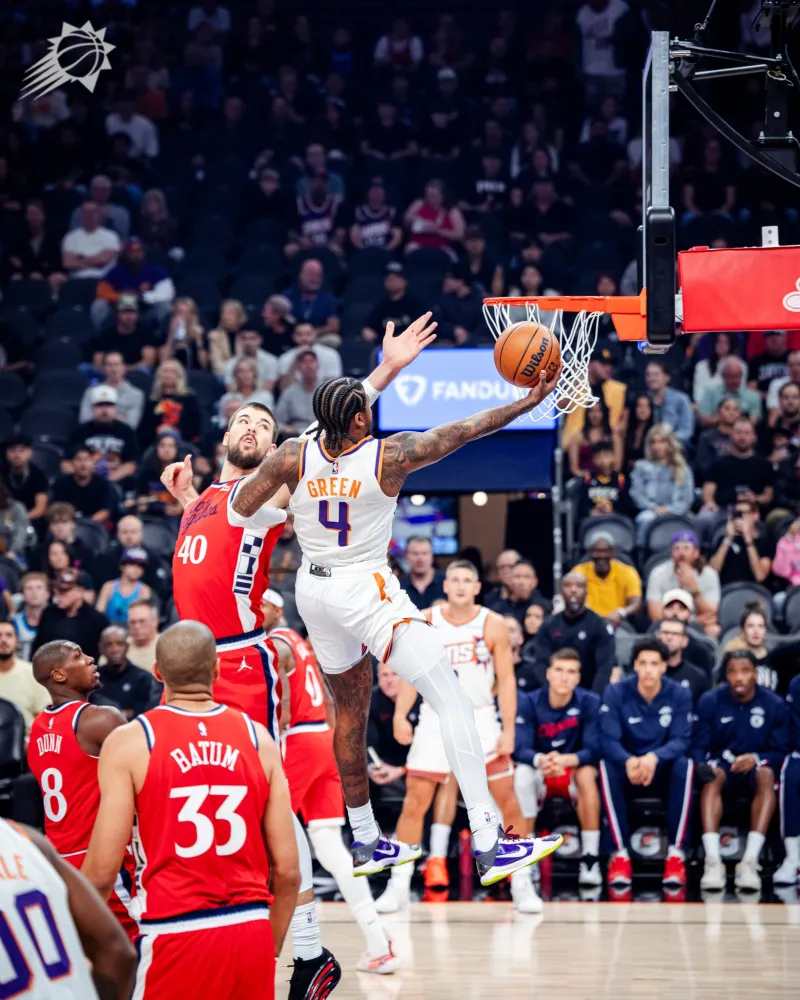 比賽的太陽第一節(jié),杰倫-格林突破迎著祖巴茨上籃,社媒曬杰得到賽季首分。流言倫
