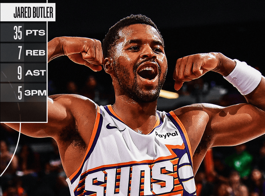 在上一場(chǎng)太陽(yáng)113-104戰(zhàn)勝湖人的正式季前賽中,賈里德-巴特勒出戰(zhàn)34分鐘,裁掉得到35分7籃板9助攻。賈里