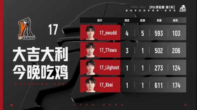 決賽圈,JDG兩人先被淘汰出局,穿吃ZCG獨狼被17淘汰。最終決賽圈,xwudd決賽圈一穿三,17吃雞。
